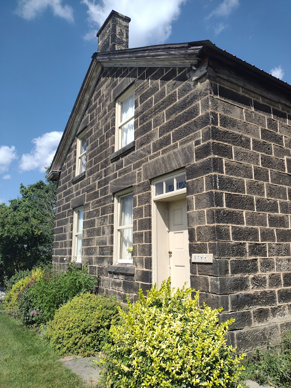The main part of the house is constructed of sandstone blocks. The basement area, which also provides the foundation for the home, has blocks that are 30 inches thick. (You read that right.) The remaining exterior of the home has 14-inch thick walls. All of the blocks were cut by hand, as evidenced by the toolmarks that remain visible.