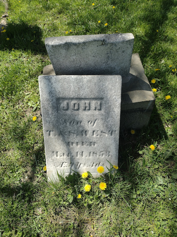 Enos, along with his mother, father, and brother John are buried in the West Family Cemetery. Also listed in the cemetery records is Manda L. Gillett, possibly the child of Ruth West Gillett. Ephraim is buried in Maple Shade Cemetery further down the road.